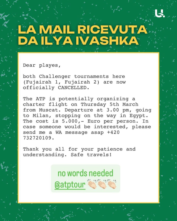 外媒此前报道,由于阿联酋富吉拉挑战赛意外被取消,为了让球员和相关随行人员安全离开中东,ATP准备包机从马斯喀特起飞,经停埃及后前往米兰。