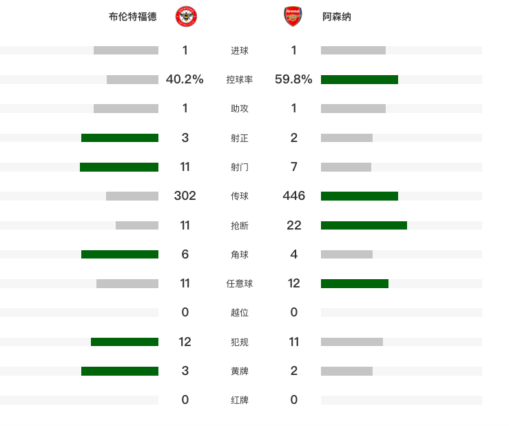 阿森纳4连胜终结,26轮积57分,以4分优势力压曼城领跑积分榜。布伦特福德26轮积42分,2分之差继续紧咬利物浦。